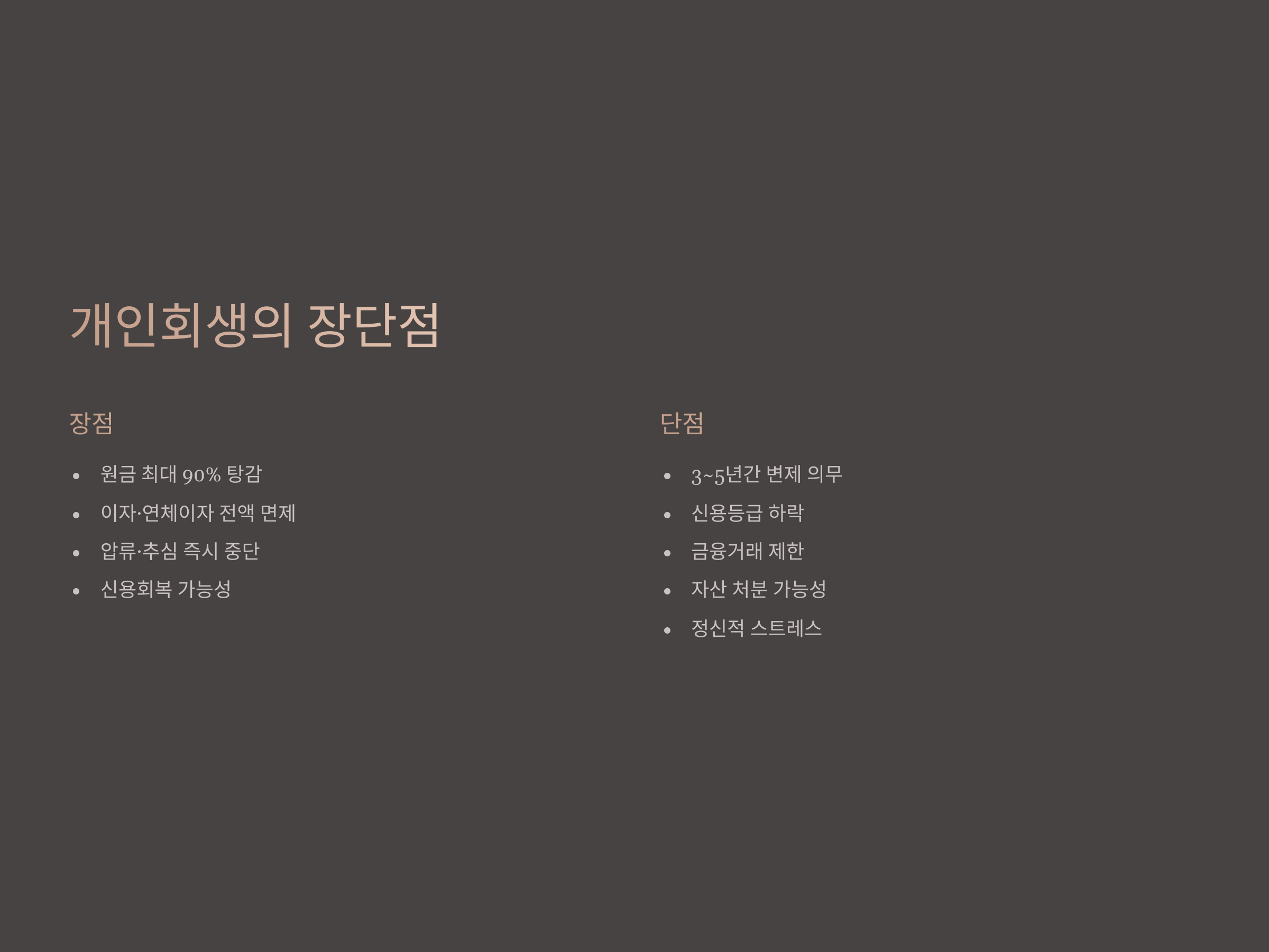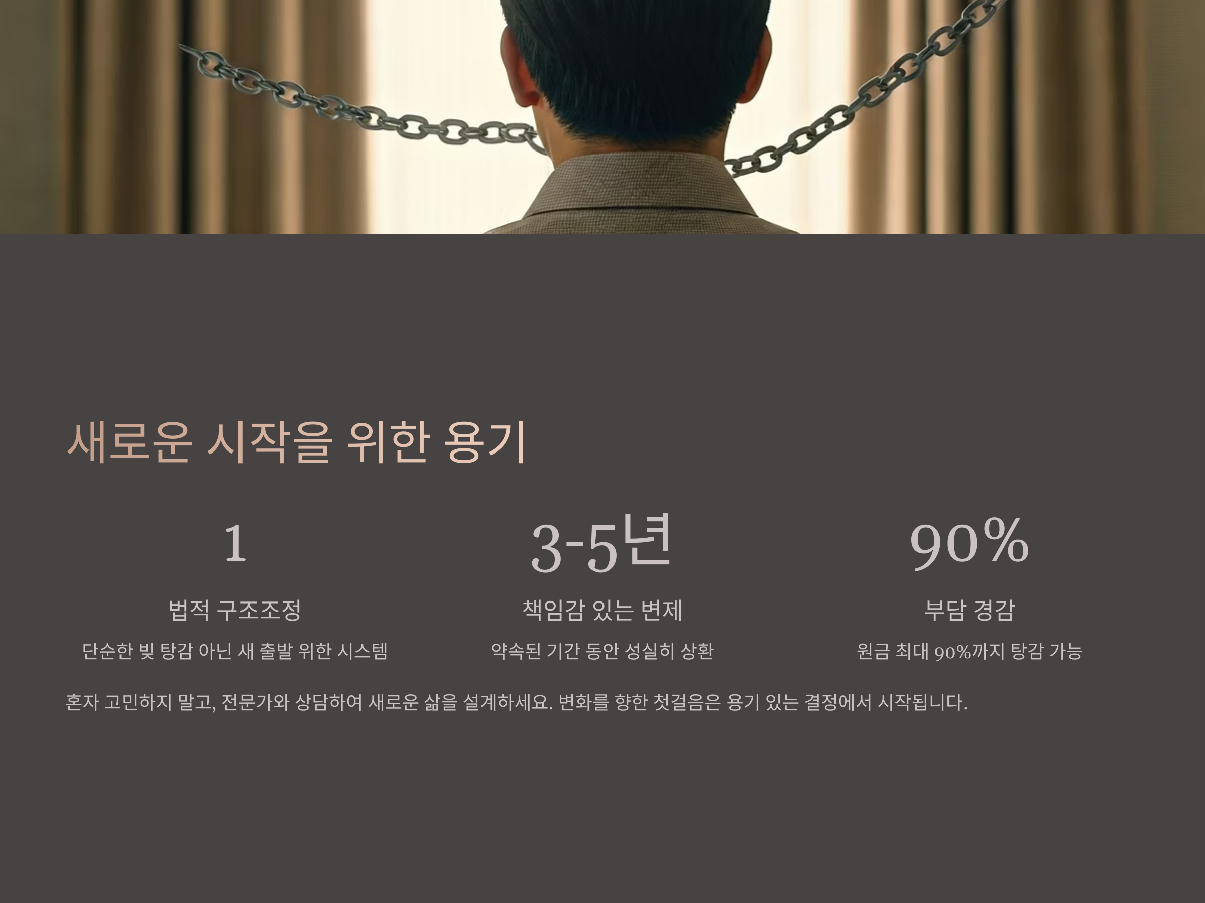개인회생은 단순한 ‘빚 탕감’ 수단이 아니라, 새로운 시작을 위한 법적 구조조정 시스템입니다. 단, 단순히 부담을 줄이는 것이 아니라 책임감 있게 변제를 약속해야 하는 제도이기도 하죠.