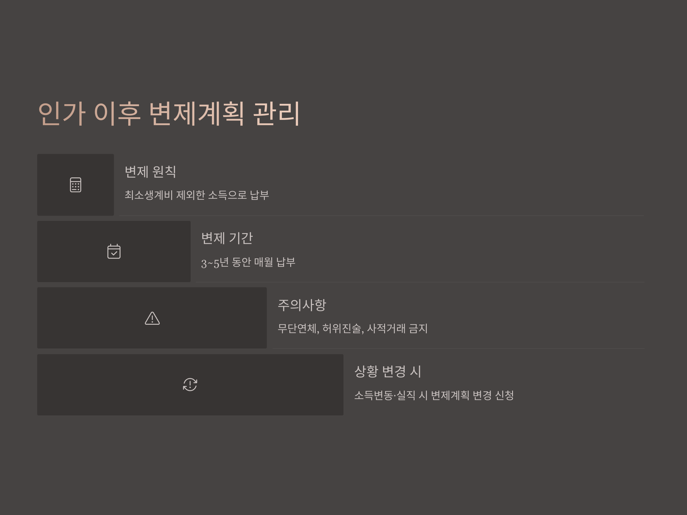 - 개인회생 인가 이후 – 변제계획과 유지 방법