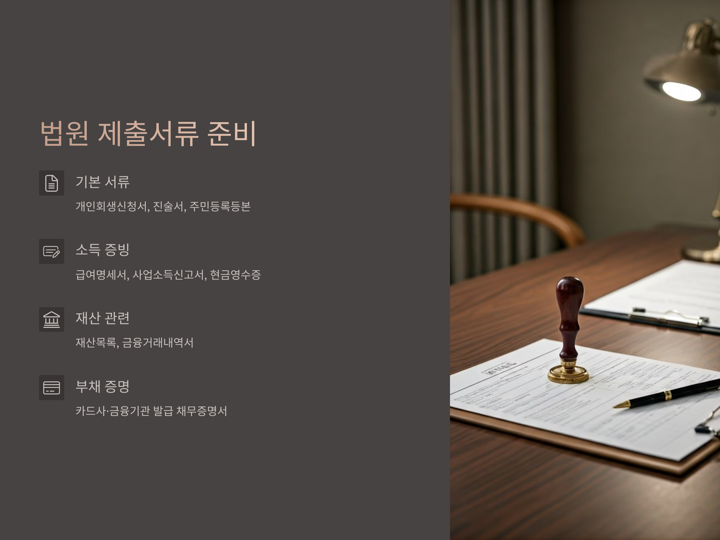 개인회생 신청 시 제출해야 할 핵심 서류는 다음과 같습니다: