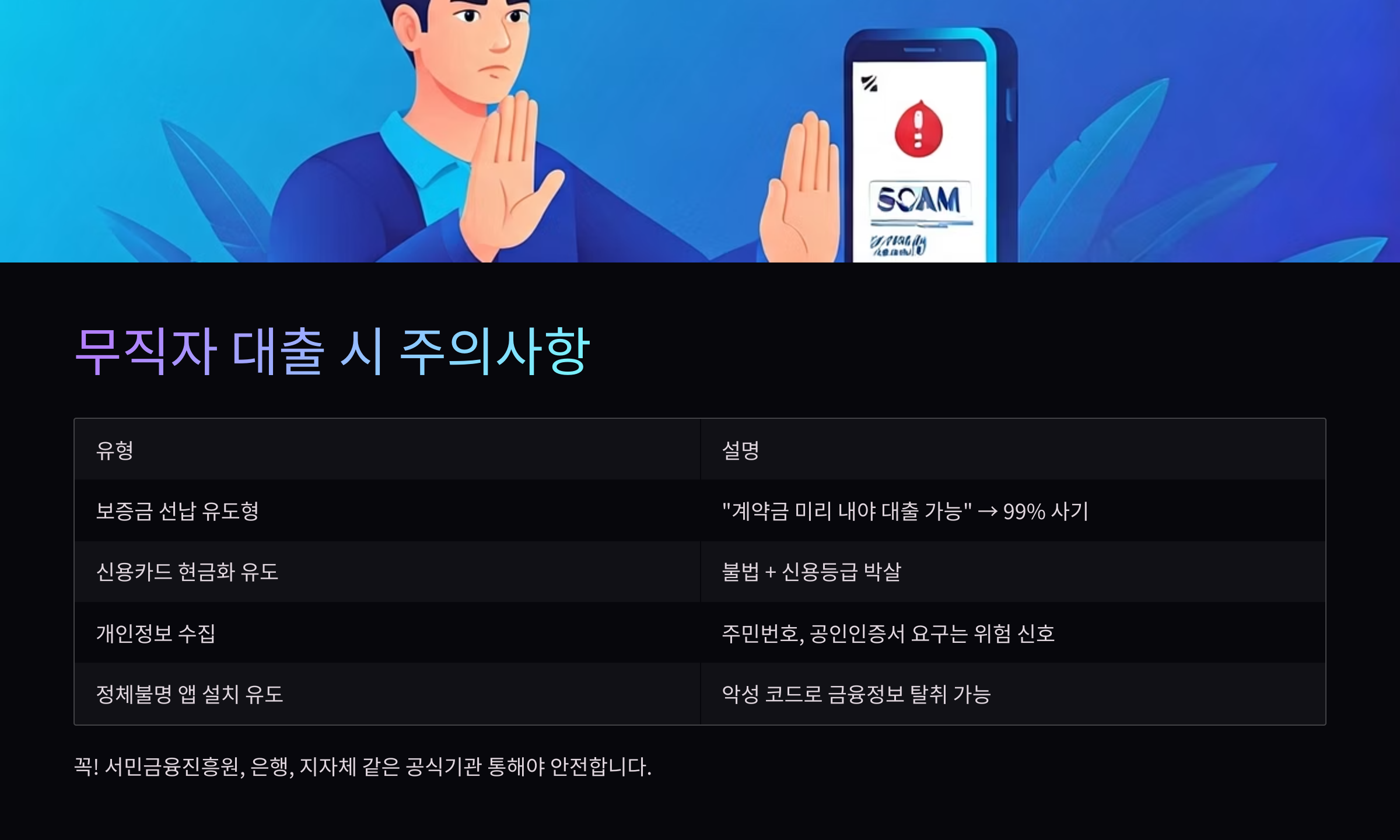 - ❗ 사기성 고금리 대출 유혹: “무직자 100% 승인” 같은 문구는 함정일 가능성 높음