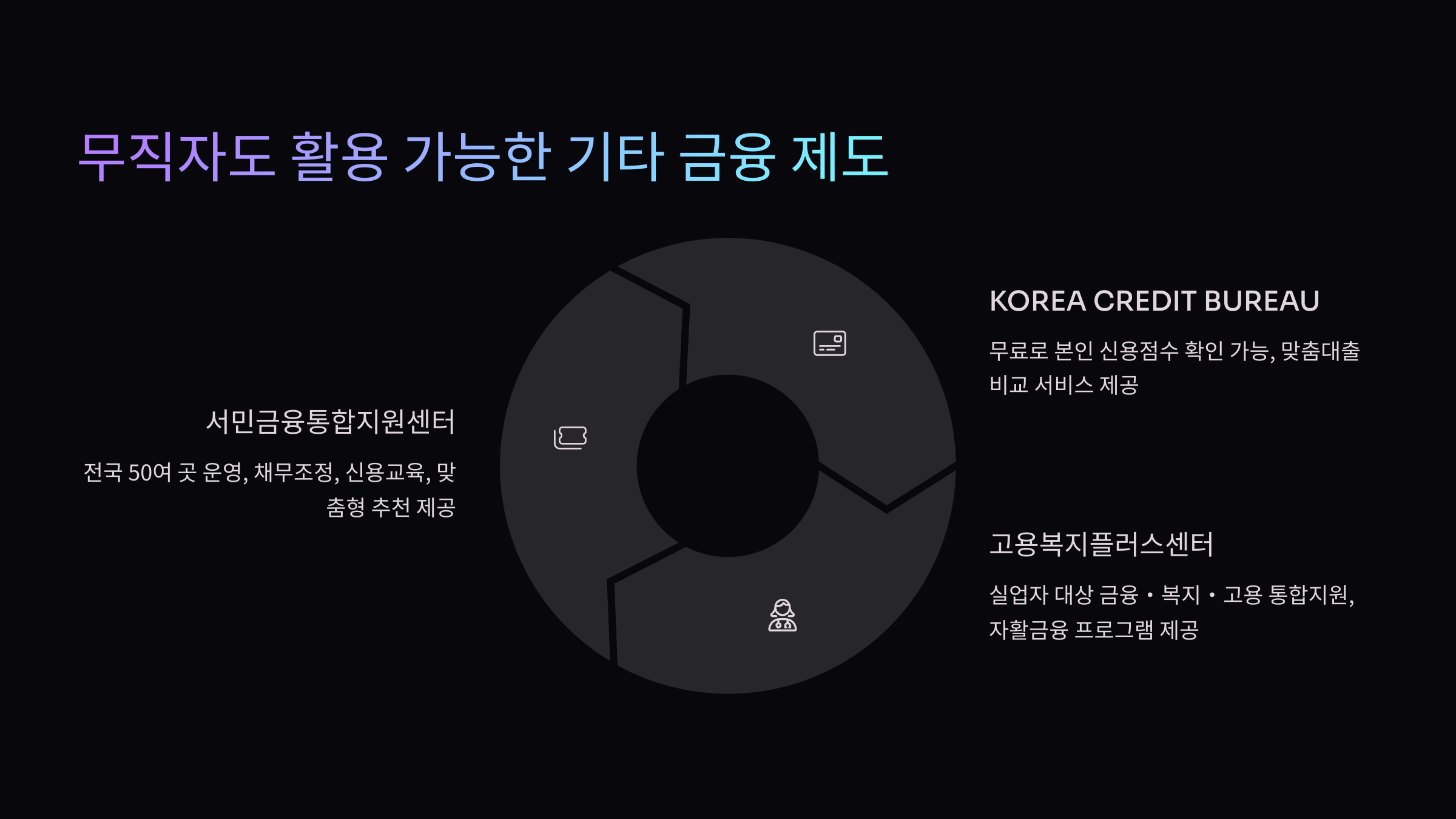 - 대출 불가 시에도 채무조정, 신용교육, 맞춤형 추천 제공