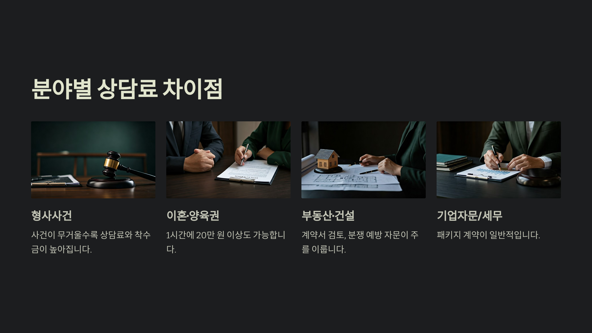 - 이혼·양육권: 민감하고 감정 소모가 큰 분야로서 상담료 1시간에 20만 원 이상도 가능.