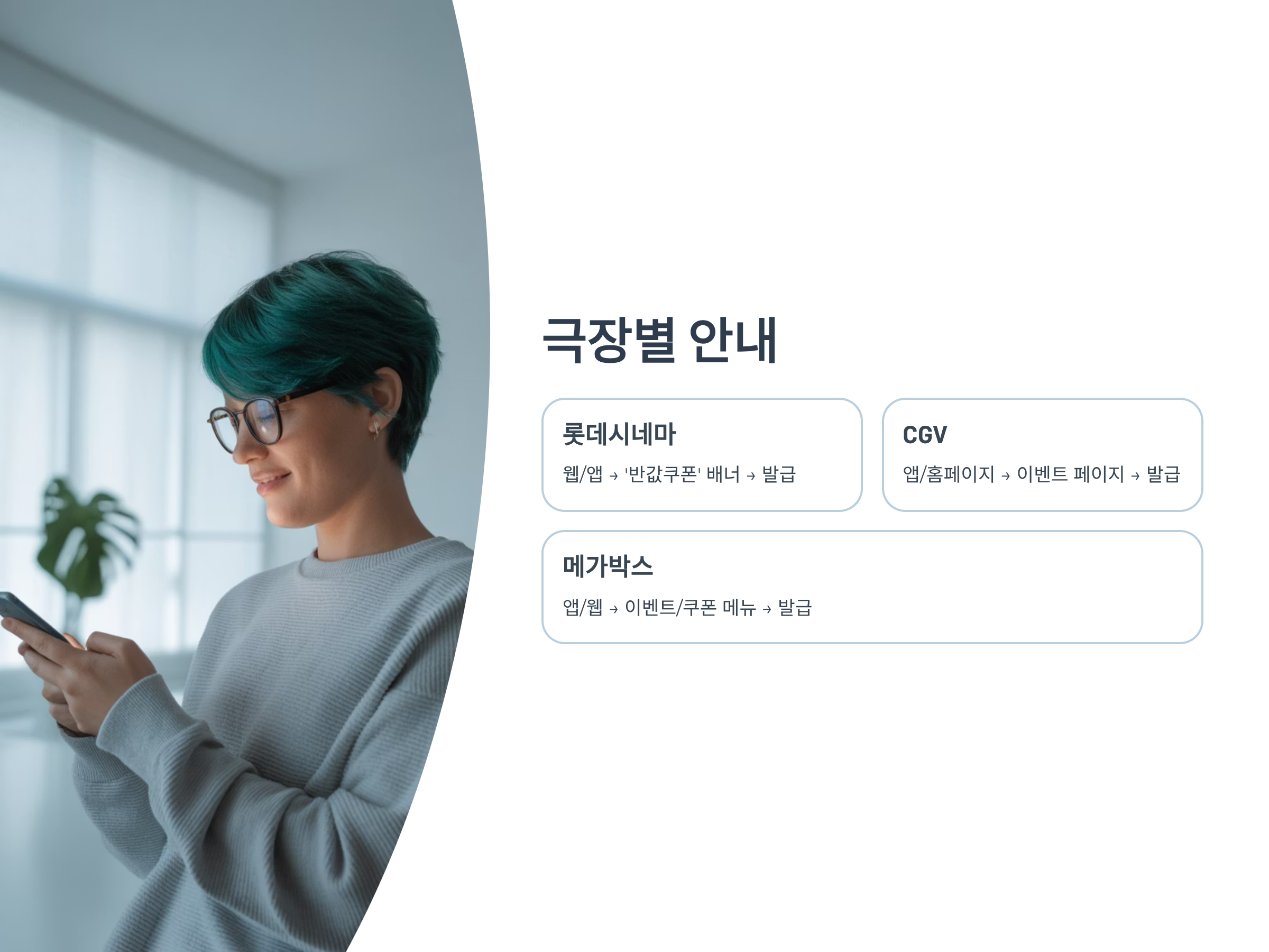 - 롯데시네마: 웹 또는 앱 접속 → ‘반값쿠폰’ 배너 → 쿠폰 발급